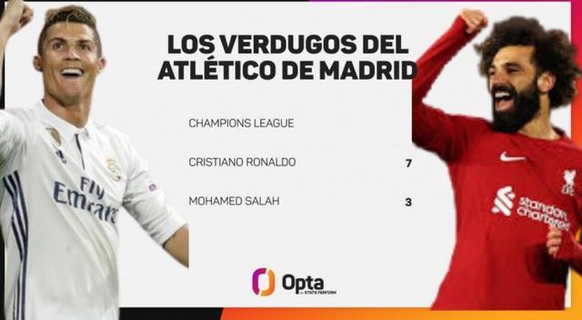 在欧冠赛场上,萨拉赫7次面对马竞打进3球。在这项赛事中,萨拉赫面对床单军团的进球数量仅次于C罗(12场7球)。