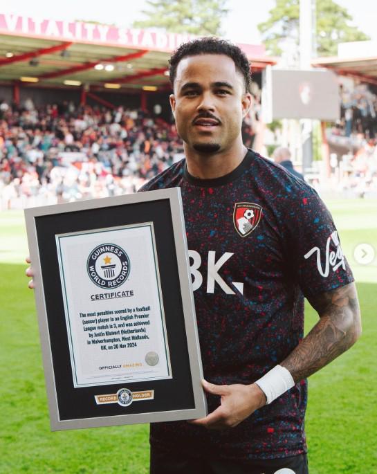 伯恩茅斯官方消息,尤斯廷-克鲁伊维特收到了吉尼斯世界纪录证书。