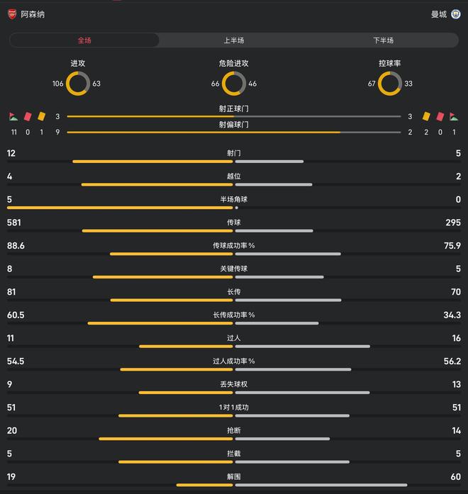 阿森纳vs曼城全场数据:射门125,控球率67%33%