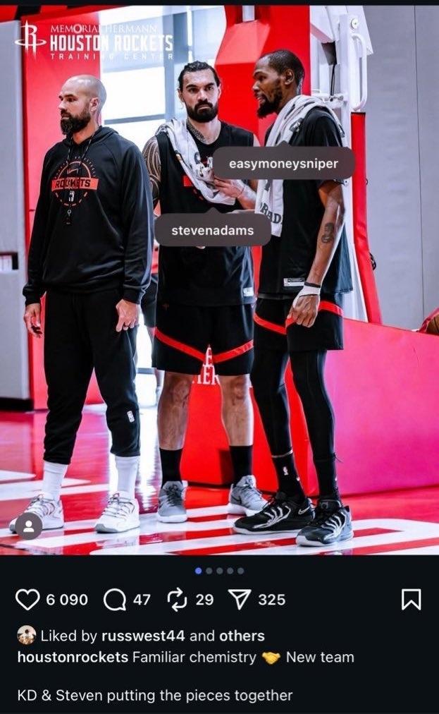 威少点赞昔日队友杜兰特与亚当斯合影火箭在今夏通过7方大交易引进杜兰特,外加续约亚当斯,让杜兰特与亚当斯的昔日队友得以重新搭档。如今火箭晒出两人的合影,并且配文写道:“熟悉的化学反应和新球队!”至于威少曾经短暂效力过火箭一个赛季,当时与昔日雷霆队友哈登搭档,但遗憾止步西部半决赛。威少在雷霆时期曾经与杜兰特、亚当斯搭档过,如今威少通过社媒点赞了火箭官推发布的这张照片,自然是耐人寻味。