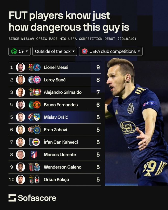 米斯拉夫·奥尔西奇就是从八年前的2019赛季开始踢欧冠的,他刚激活一个里程碑,就是欧冠禁区外远射进球,5个,这追平了前十的门槛。历史上刚好只有10个球员在欧冠有过至少5个禁区外远射进球。米斯拉夫·奥尔西奇是最近的一个,跟他一样有5个的是扎哈维、卡赫韦奇、略伦特、加来诺、柯克曲。B费排名第4,有6个。亚历杭德罗·格里马尔多第三,7个。萨内第二,8个。梅西是金靴,9个。前十没有C罗,C罗连5个都达不到。