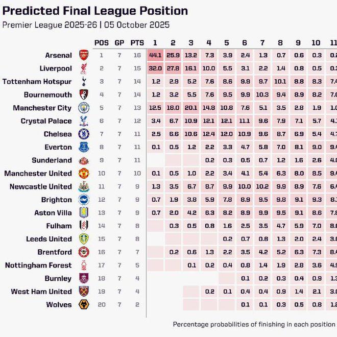 如此一来,超级计算机也实时跟进了它对本赛季英超冠军的模拟演算,阿森纳的夺冠概率提升到44.1%,利物浦则下降到32%,不再试英超冠军的第一大热门。