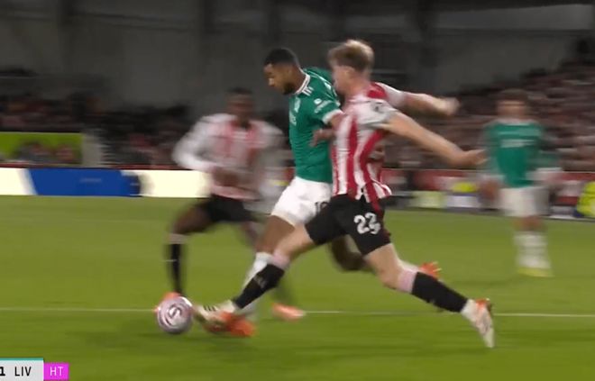 这个进球前发生了一连串混乱的事件。首先萨拉赫在左路对沙德犯规,随后达姆斯高拿到球并迫使马马尔达什维利做出扑救。布伦特福德将球发展到左路,瓦塔拉突破范戴克后被犯规,地点看似在禁区线外。