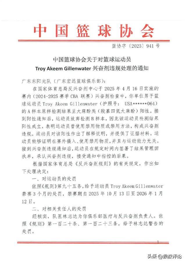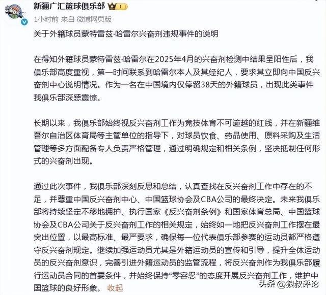 此前,新疆男篮官方也提到了哈雷尔在中国境内仅停留38天,出现此类事件我俱乐部深感震惊。值得一提的是此前广东大外援吉伦沃特的情况也比较类似,吉伦沃特遭到禁赛三个月,广东东阳光队(广东宏远篮球俱乐部)作为管理单位受到了警告及负担20例兴奋剂检测费用(人民币36000元)的处罚,该单位的医疗与反兴奋剂负责人、队医林志达被给予警告处罚。