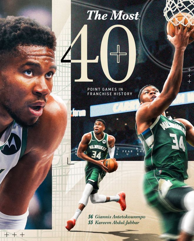 此役扬尼斯还一战创造多项纪录:1.拿到本赛季第二次40+10+5;2.雄鹿队史56次40+超过贾巴尔成为队史第一人;3.过去50年里扬尼斯有联盟最多的40+15+5