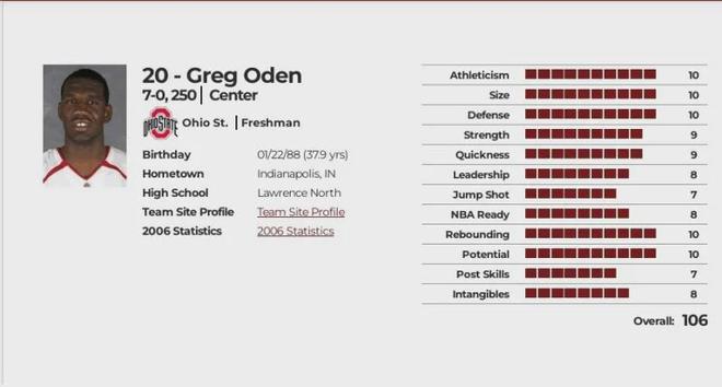 我放上奥登在2007年参加联合试训的体测数据大家感受一下当时没有掌长掌宽项目,但通过他和小杨比掌可以看出两人手掌不相上下,小杨的手掌长是25.4厘米,掌宽28.6厘米,属于超级大巴掌,裸足身高2米11,臂展2米24,站立摸高2米84,体重116.6公斤,变向敏捷测试11秒67、四分之三冲刺3秒27、站立弹跳81厘米、跑动最大弹跳86厘米,体测数据外,美国媒体称他为集力量、身体、速度、高度、臂展于一身的完美中锋。美国NBA DRAFT网站给他综合评定106分的网站历史第一高分, 后来的蔡-威廉森是100分,文班亚马是101分,奥登在强壮度、尺寸、防守、篮板、潜力方面都是满分,唯一不足的就是跳投和篮下低位技术,选秀模板设定为海军上将大卫-罗宾逊和指环王比尔拉塞尔这种NBA传奇。